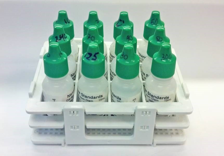 Organization rack to hold MSP, a Division of TSI, particle size standards.
