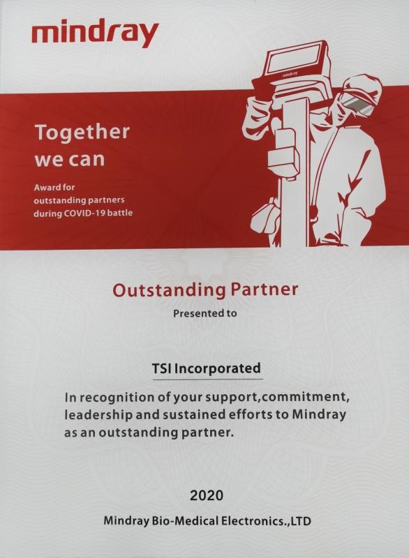 TSI公司在疫情期间克服各种困难,及时为深圳迈瑞生物医疗电子股份有限公司的呼吸机提供了流量传感器产品, 迈瑞医疗为TSI公司在2020抗疫期间对迈瑞的鼎力支持,帮助驰援各大医院挽救生命表示衷心的感谢,特为TSI公司颁发“抗疫突出贡献奖”。