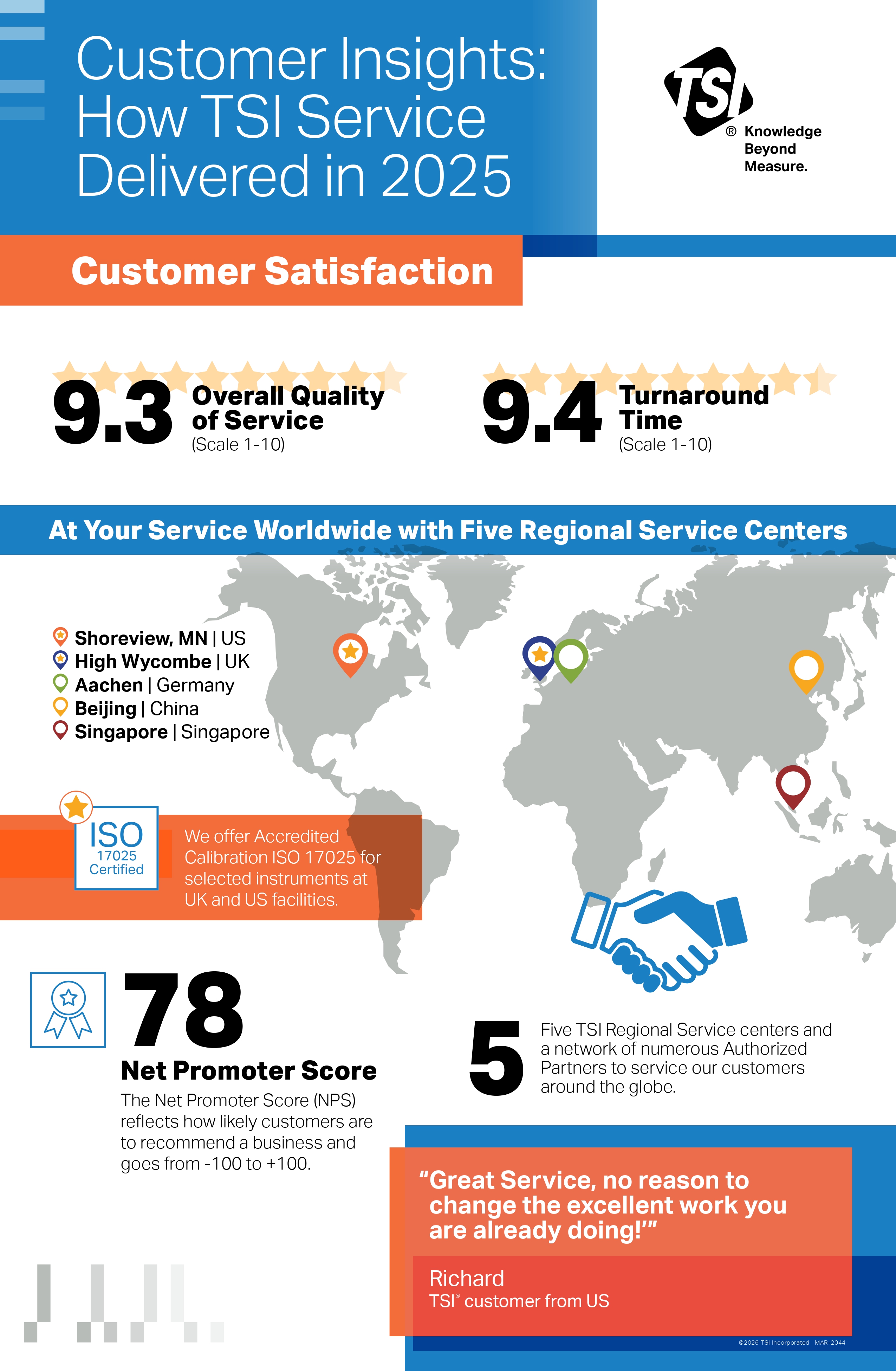 At TSI®, delivering exceptional service is at the core of our commitment to customers worldwide. In 2025, this dedication translated into record-high performance scores, reflecting the trust customers place in our technical expertise, responsiveness, and global support network. These results reinforce our mission to ensure every TSI instrument performs at its best—today and throughout its lifecycle.