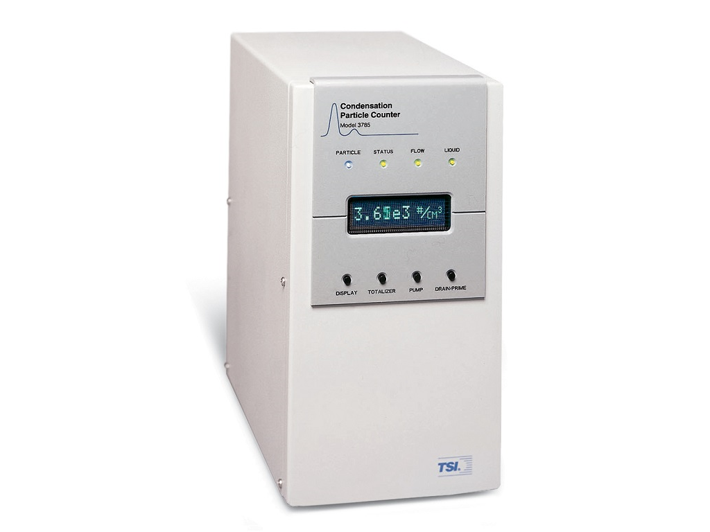 The Model 3785 Water-based Condensation Particle Counter* uses water to enlarge particles for easy detection. The Model 3785 detects particles from 5 to >3000 nm. It provides a wide, dynamic, particle-concentration range. Featuring both a single-particle-counting mode with continuous, live-time coincidence correction and a photometric mode, this particle counter measures concentrations up to 10 7 particles/cm 3 with high accuracy. It offers quick response and is compatible with our SMPS systems.