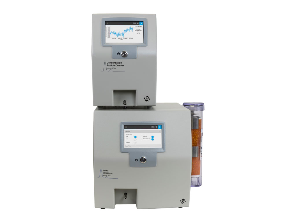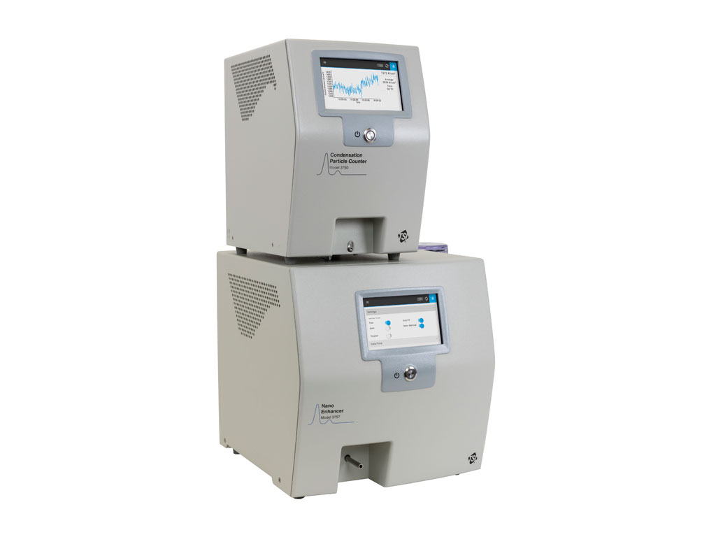 Le Nano enhanceur 3757 détecte des particules aussi petites que 1 nm de diamètre géométrique (1,4 nm de diamètre équivalent à la mobilité électrique), en utilisant une conception unique de flux d'air de gaine qui confine le chemin d'écoulement de l'aérosol près de l'axe central du condenseur. Un échantillon d'aérosol est aspiré en continu par un capillaire et mélangé à un flux d'air de gaine propre et sec qui passe par un saturateur chauffé où les vapeurs de diéthylène glycol (DEG) diffuse dans le flux d'air de gaine. L'échantillon d'aérosol et la vapeur de DEG passent ensemble dans un condenseur refroidi où la vapeur de DEG devient sursaturée et prête à se condenser. Les particules présentes dans le flux de l'échantillon servent de noyaux de condensation. Une fois la condensation commencée, les particules dont le diamètre est supérieur à un certain seuil se transforment rapidement en gouttelettes suffisamment grosses pour être facilement détectées par un CNC conventionnel à base de butanol.