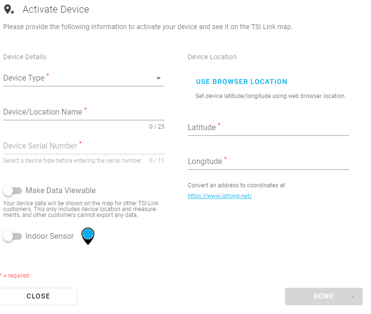 - Enregistrez votre moniteur en saisissant les informations suivantes et cliquez sur DONE. Si vous ne voyez pas l'écran d'enregistrement de l'appareil, cliquez sur l'icône « Plus » se trouvant en bas à droite de la carte.