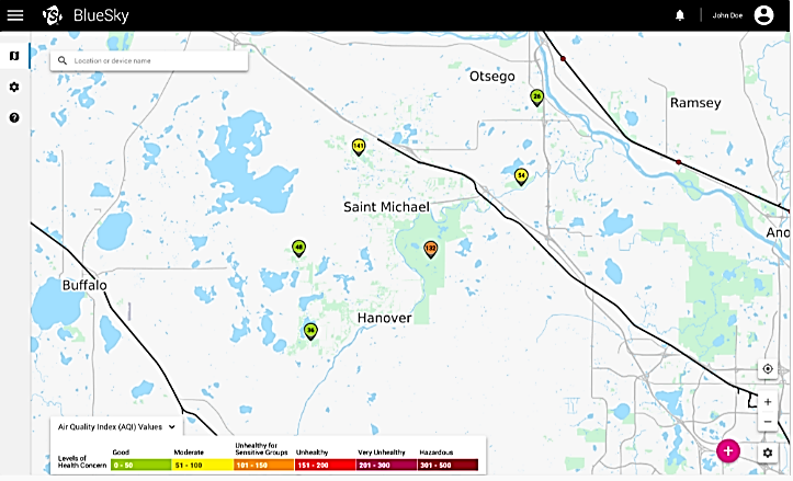 Chaque épingle sur la carte représente un moniteur de la qualité de l’air. La couleur de l'épingle indique la lecture en temps réel des PM2,5 ou PM10 basée sur l'indice de qualité de l'air de l'Agence de Protection de l'Environnement (EPA AQI). Les épingles noires pleines indiquent que le capteur est enregistré comme un capteur extérieur ; les épingles noires avec un intérieur blanc indiquent que le capteur est enregistré comme un capteur intérieur.