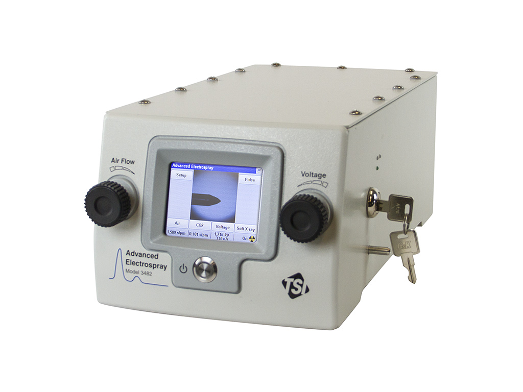 The EAG Model 3482 produces high concentrations of monodisperse, submicrometer particles from 2 to 150+ nm (initial droplet diameter of 150 nm, nominal). A syringe pump pushes a grounded liquid solution or suspension into the electrospray and through a capillary tube into an electrical field. The electric field pulls the liquid from the capillary, creating a Taylor cone and forming individual droplets. Air and CO 2 mix with the droplets to evaporate the liquid content. During the drying process, the particles are neutralized using a soft X-Ray neutralizer.