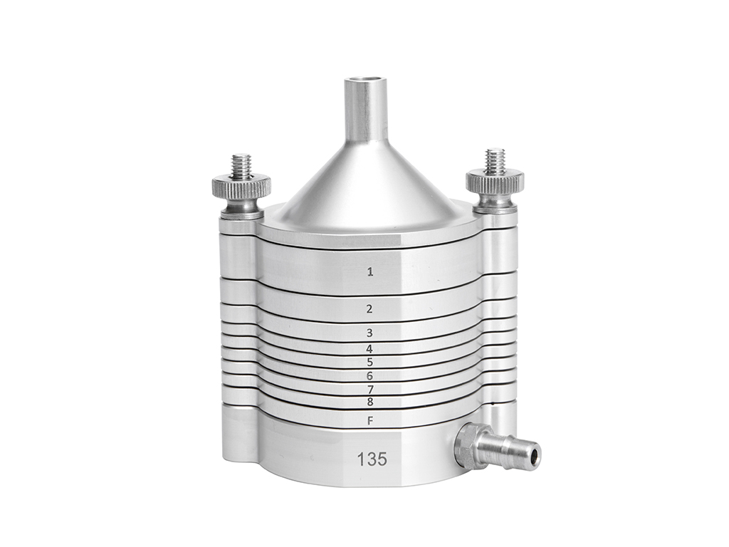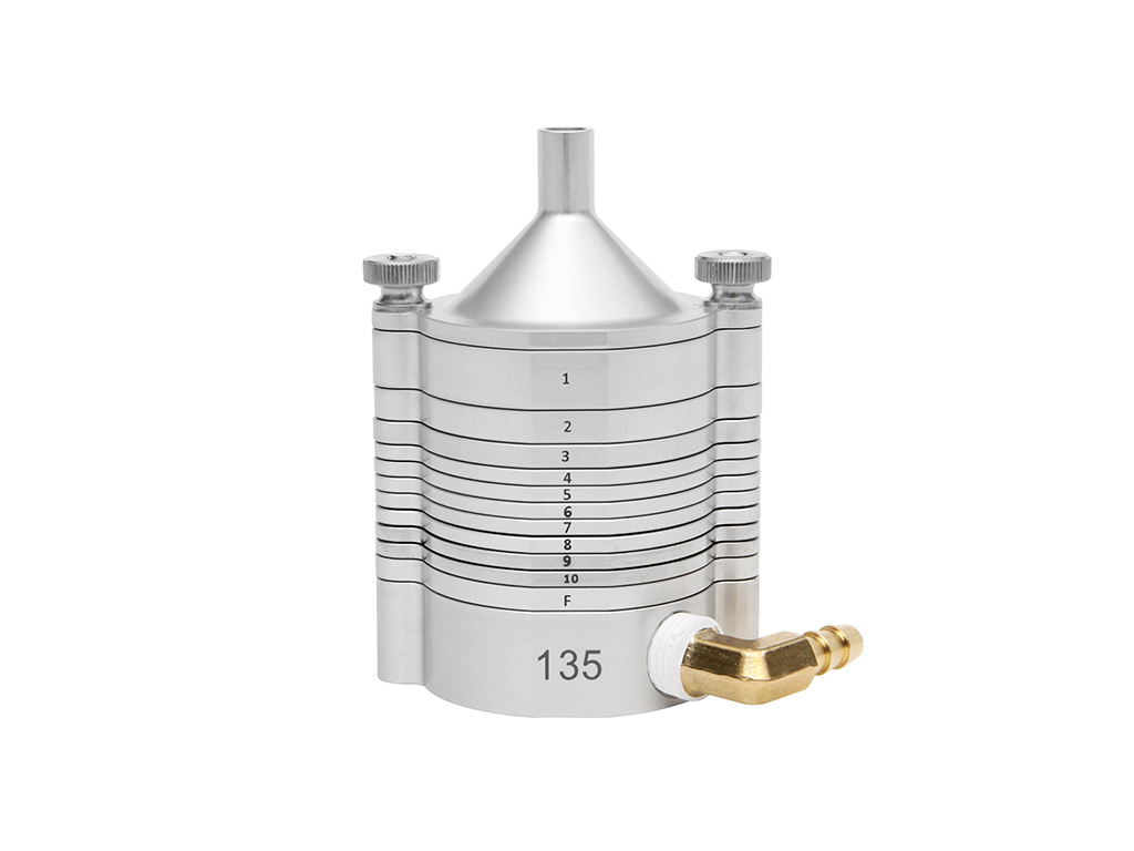 The 135-6 and 135-8 models can be used with personal sampling pumps since they have a low pressure drop. The 135-10 requires a larger vacuum pump due to the larger pressure drop associated with the last two stages. The 6- and 8-stage versions of the Mini MOUDI™ Impactor 135 are ideal for personal sampling applications and replace the older Marple personal impactors on the market.