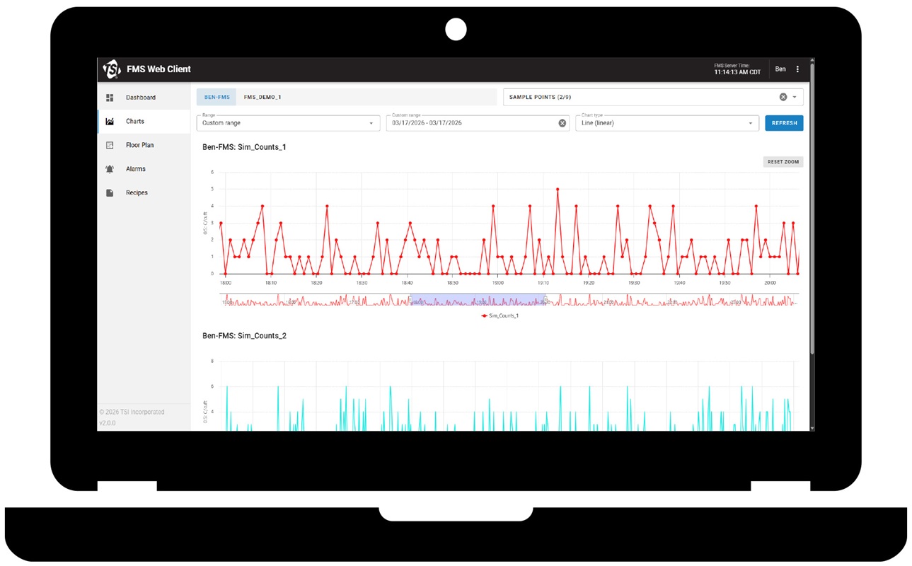FMS 6 with FMS Web Client is an advanced, reliable, and user-friendly facility monitoring software suite that features a truly distributed architecture. High availability databases and hot standby system failover functionality assures compliance and peace of mind. Standard inputs include: airborne particle counters (multiple manufacturers supported), temperature/humidity, differential pressures, air velocity and digital inputs. Use with the following TSI instruments to optimize performance:
