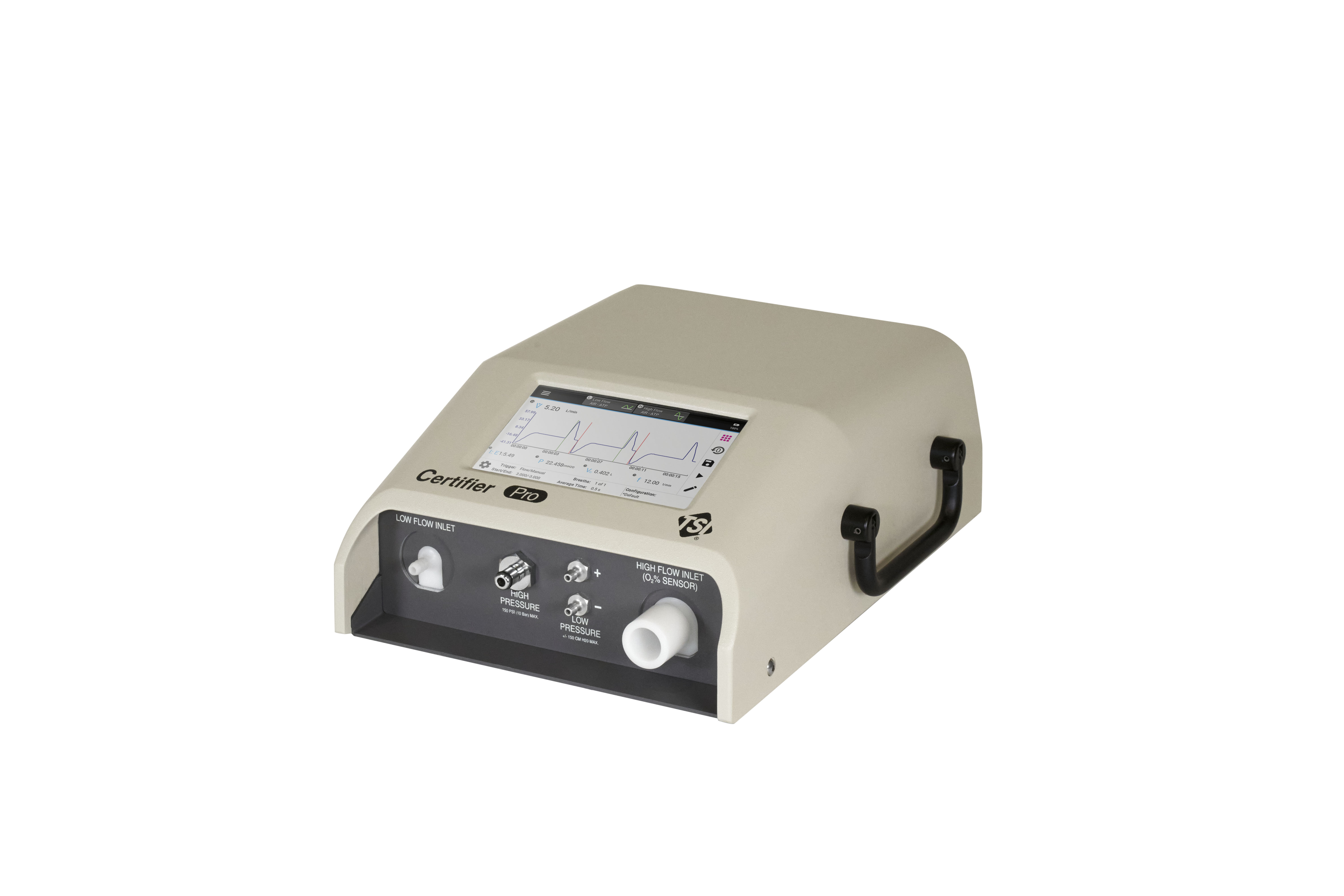 The Certifier™ Pro Flow Analyzer combines high flow and low flow measurements with pressures, oxygen concentration, and temperature. This multi-function pneumatic test instrument can measure 28 different test parameters and graph data in real-time. Pressure and temperature compensated bi-directional flow sensors deliver highly accurate gas flow measurements with a fast rate of response and industry-leading, low-pressure drop. Users can measure using STP, ATP, BTPS, BTPD, or user-defined gas conditions and test breath rates up to 1500 bpm.