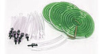 Das Kit enthält: (3) 5-Fuß-Doppelschläuche, (10) 3/16-Inch-Schlauchadapter (weiß) und (10) 1/4-Inch-Schlauchadapter (schwarz).